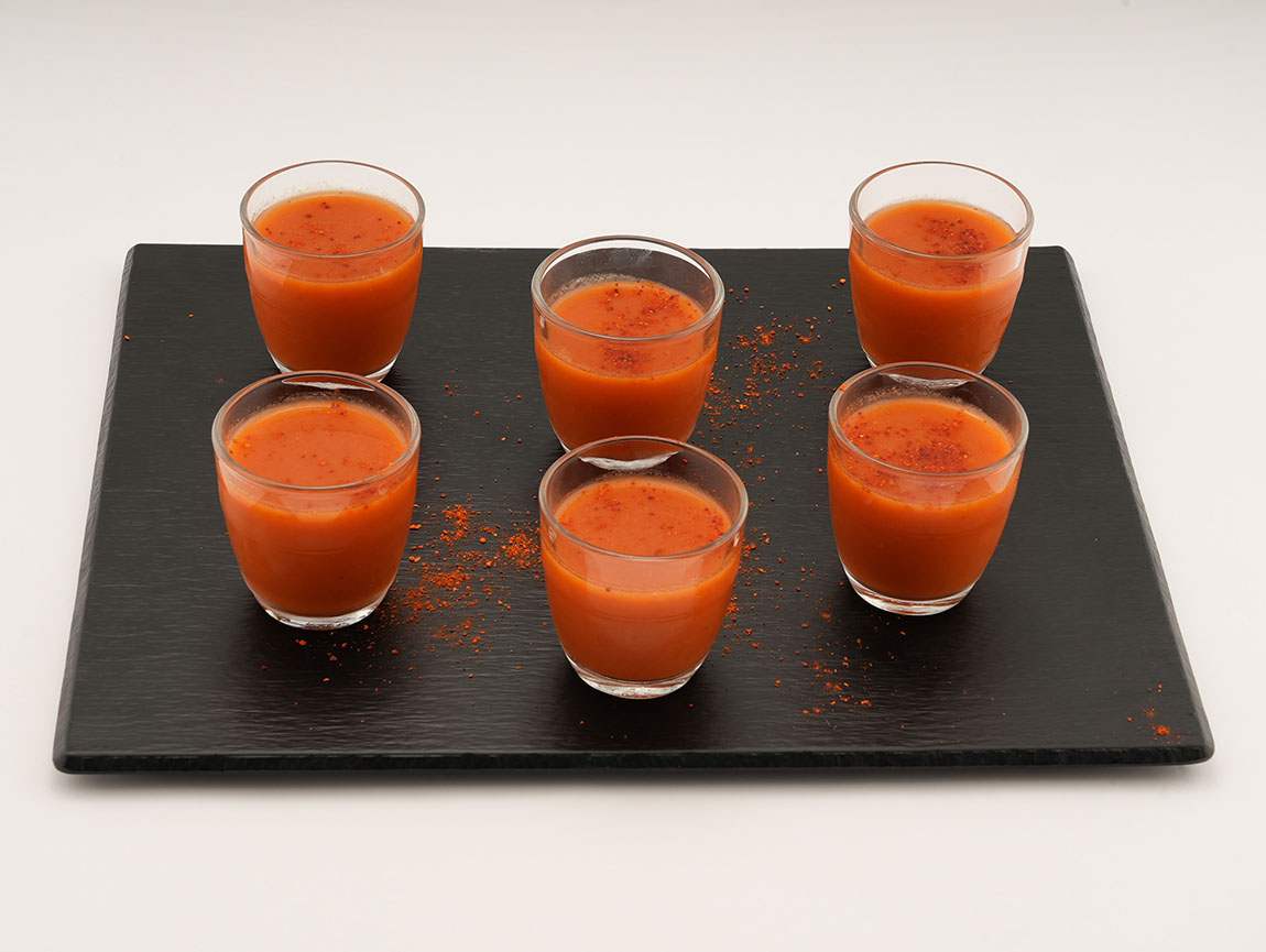 Cuillère végétale: poivron rouge, carotte, pomme granny-smith, concombre, fromage frais, et estragon