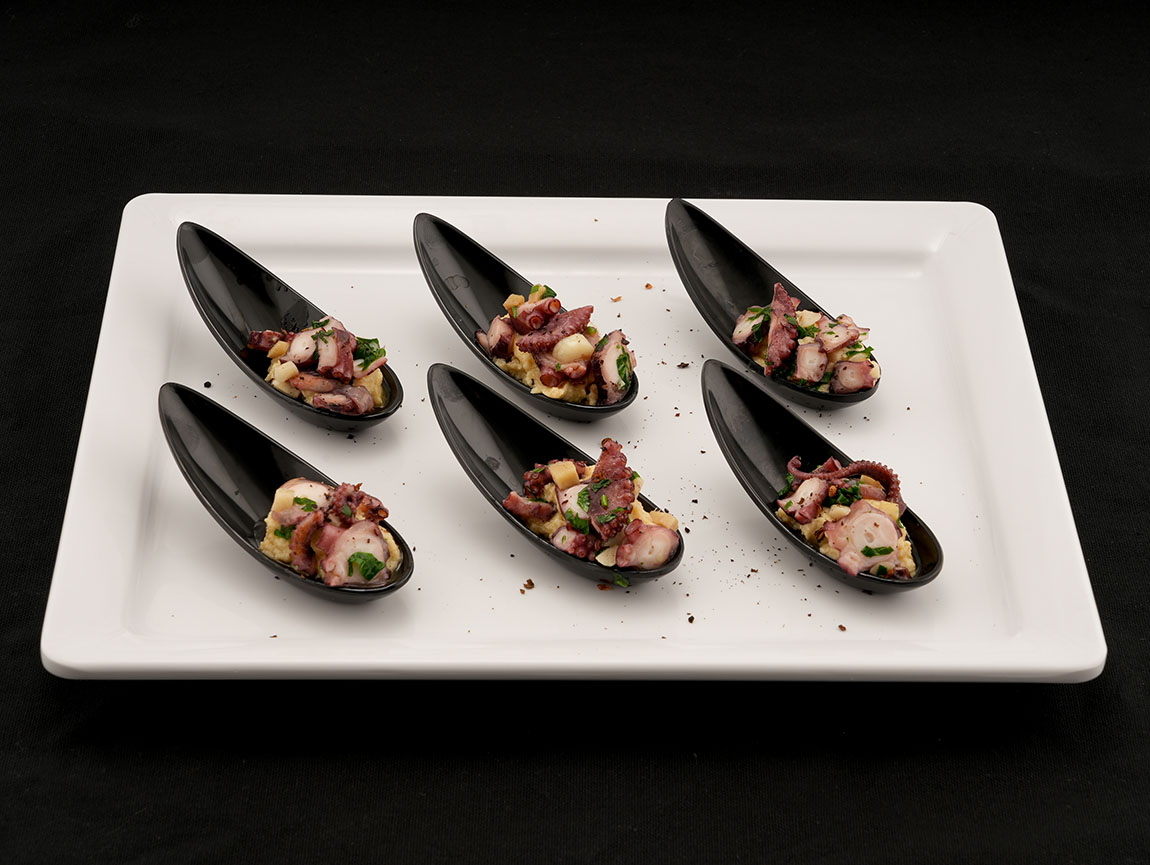 Cuillère de houmous et poulpe poèlé à l'ail et persil