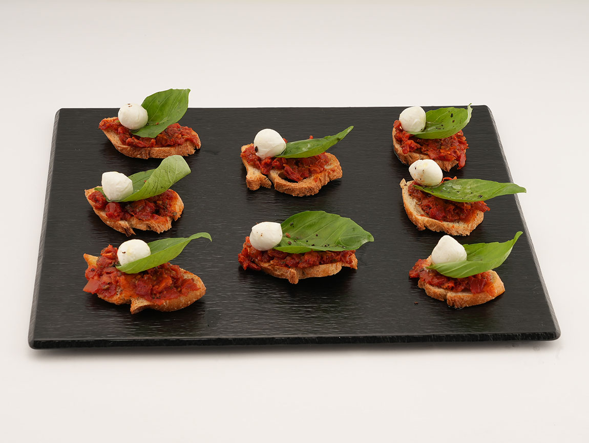 Toast tartare de tomate, feuille de basilic et bille de mozzarella