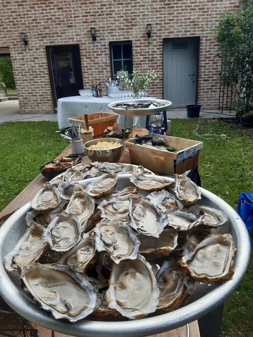 Huîtres ouvertes devant vos invités accompagnées de saucisses chipolatas, pain de seigle, beurre demi-sel et citron (x4).