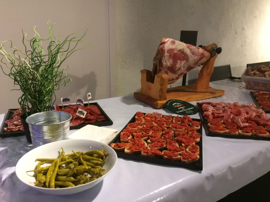 Atelier de jambon, taillé en copeaux devant les convives et service sur toast avec tartare de tomates et guindillas.