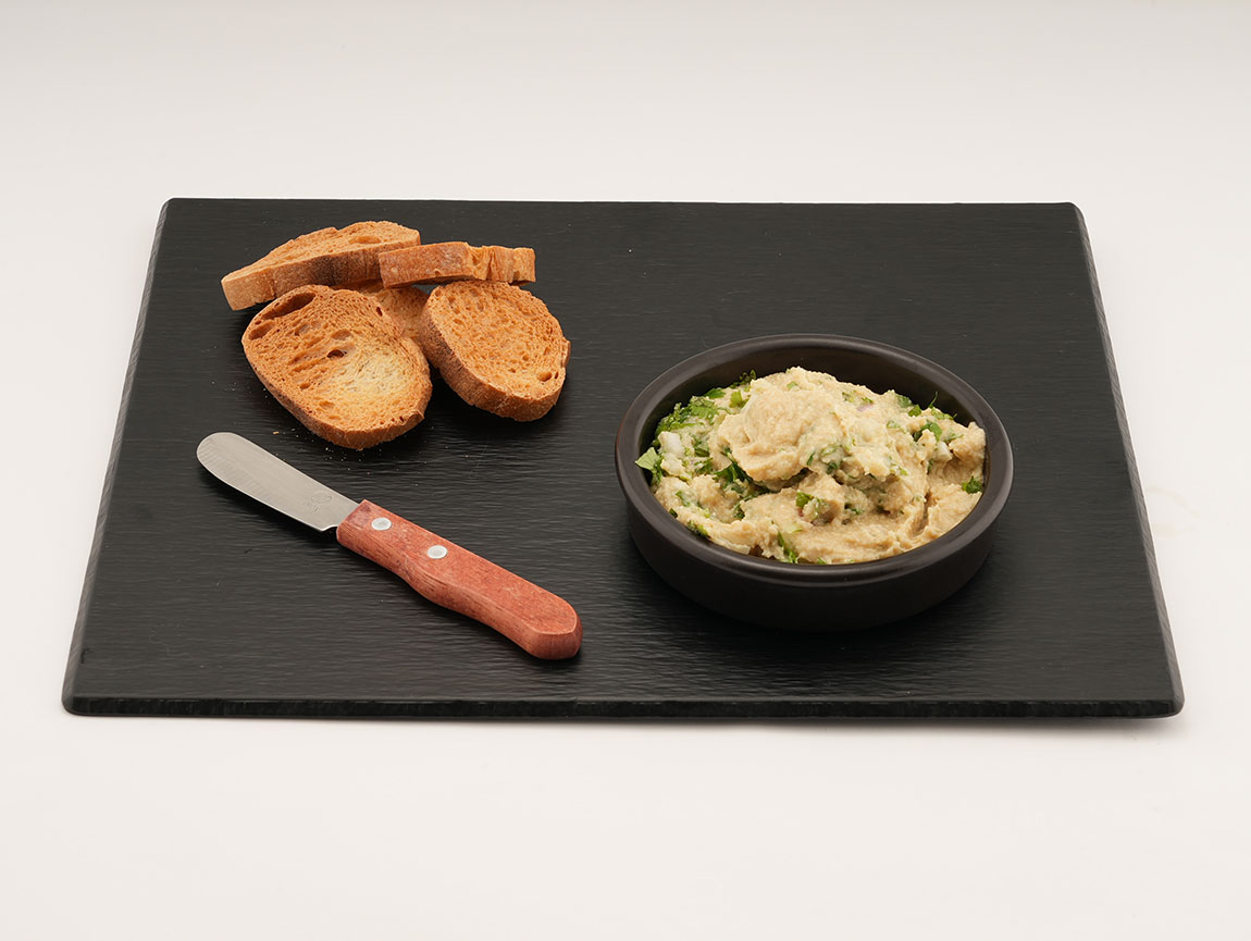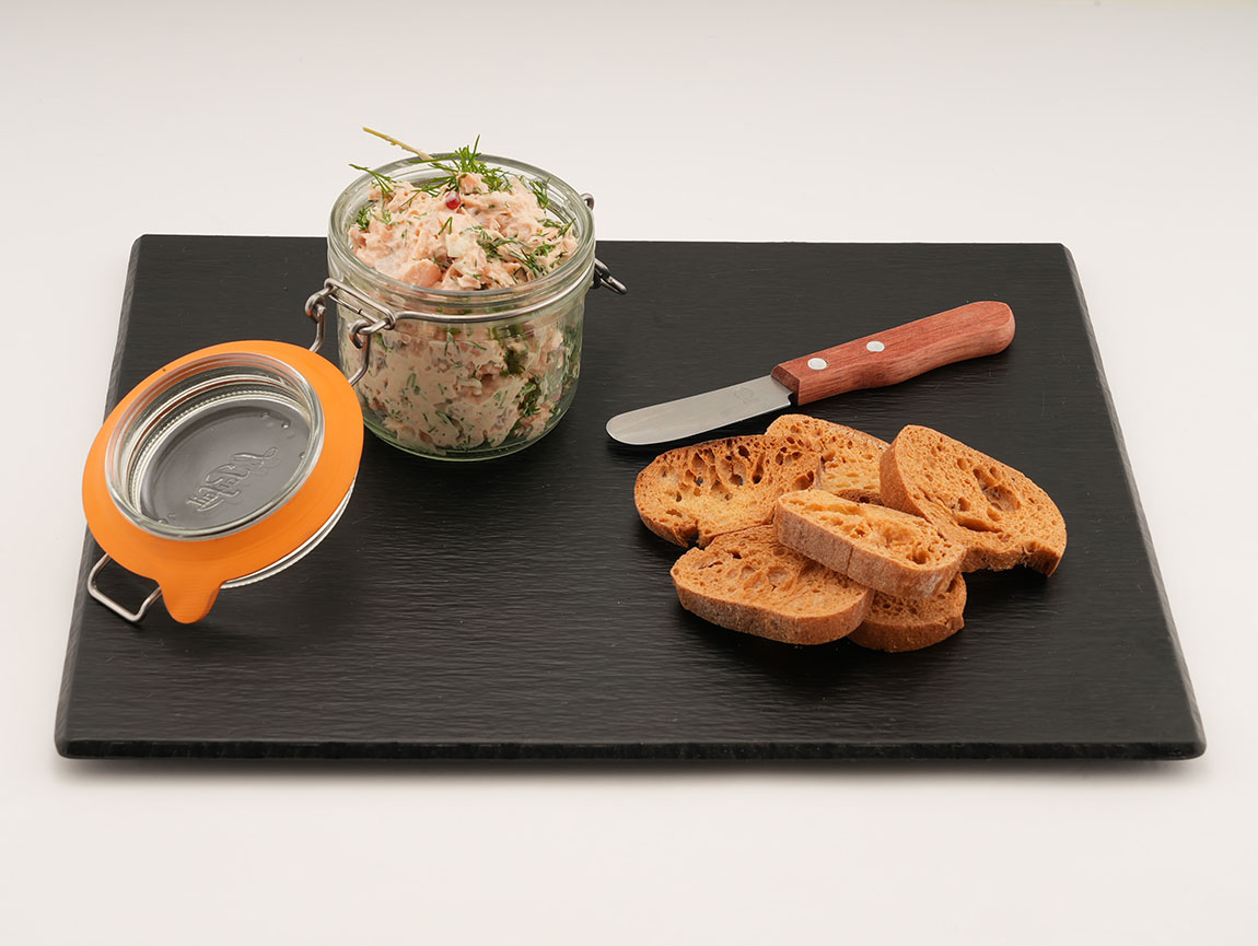Cassolette de rillettes de saumon maison à l'aneth accompagnées avec toasts de pain grillé
