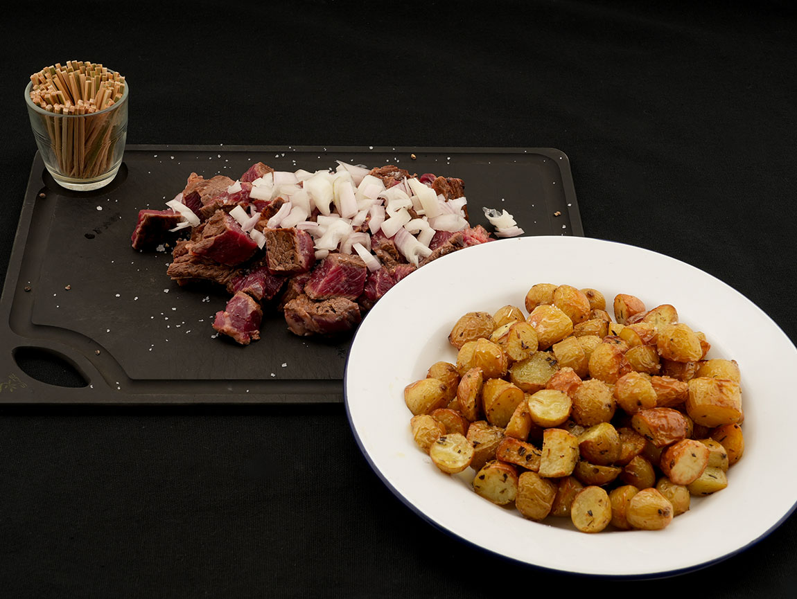 Pièce du boucher et échalotes, pommes de terre grenaille au romarin